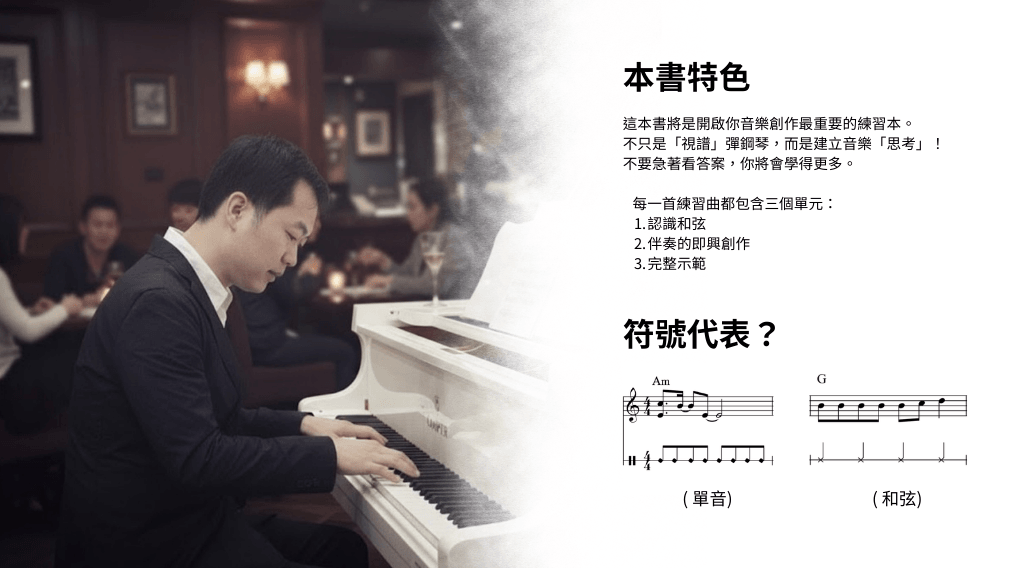 這是我為您準備的伴奏引導。每一個練習我都精心設計了不同主題,請在彈奏時細細體會、思考並創造!